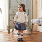 تنورة مطوية للبنات مصنوعة من مزيج فعال من 59% قطن و40% بوليستر و1% سباندكس. مبطنة بالكامل بالقطن، وتوفر الدفء المتوازن والتهوية لارتداء مريح. مثالية للأيام الباردة، أكملي المظهر بسترة بيضاء وجوارب طويلة حتى الركبة لإطلالة أنيقة ومتطورة.