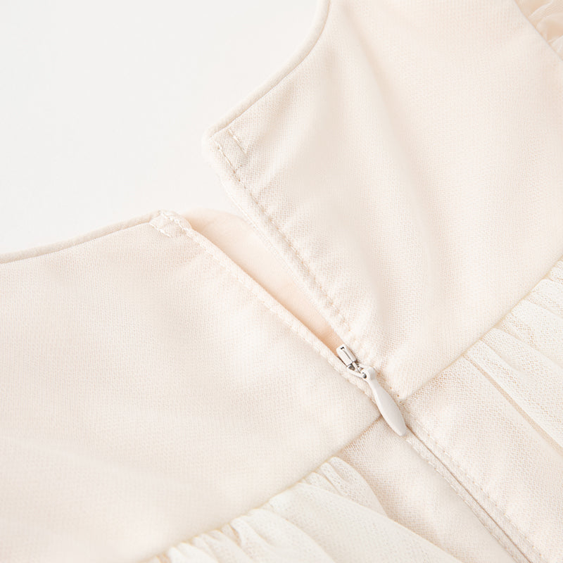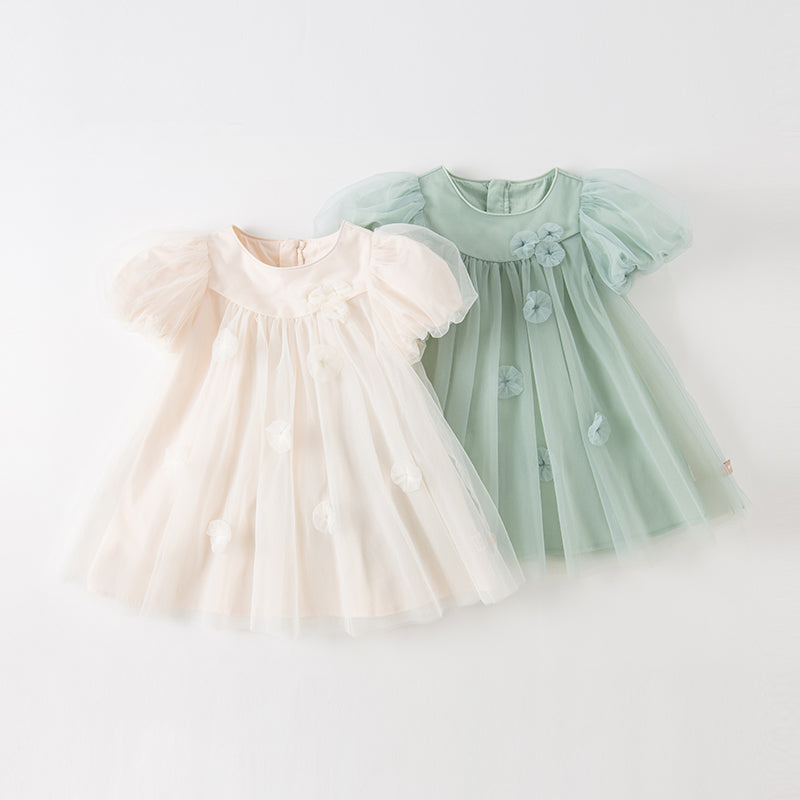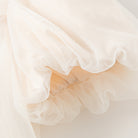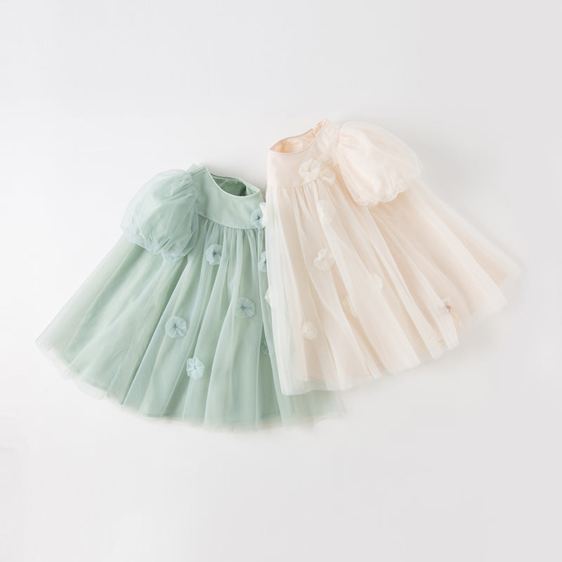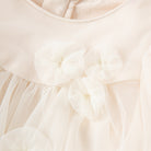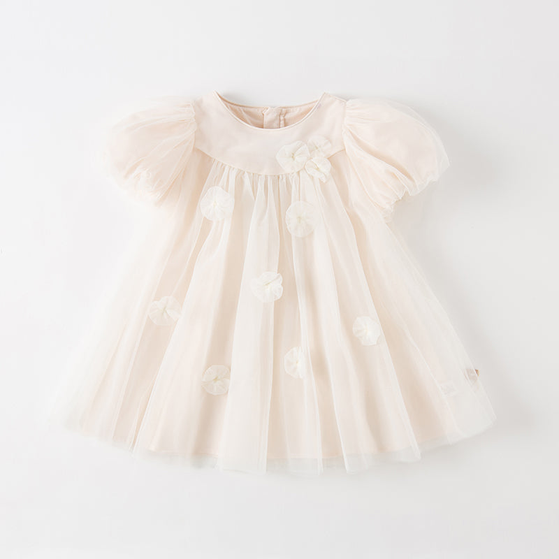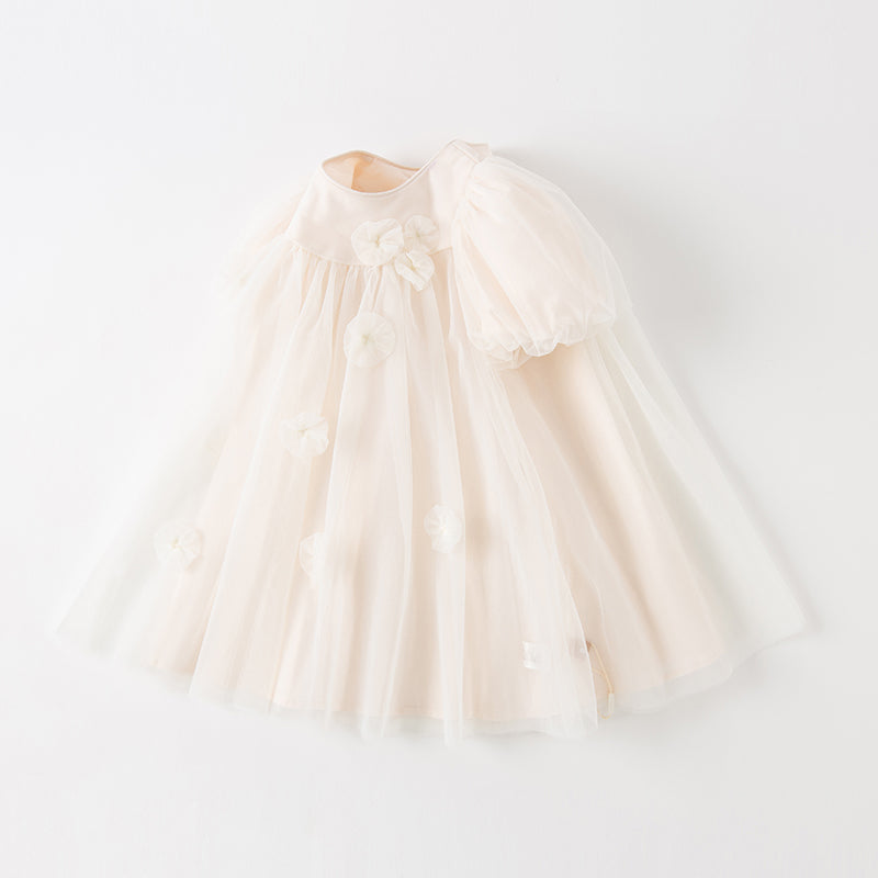 This elegant cream tulle dress features 3D tulle flower details and puff sleeves. Lined with soft cotton for comfort, it's perfect for special occasions.