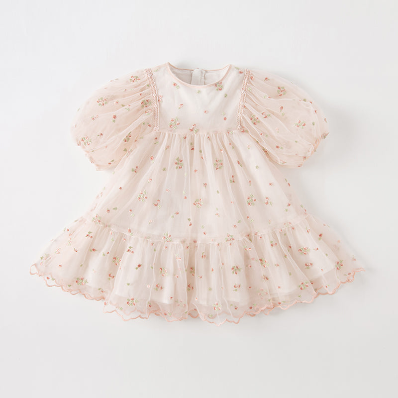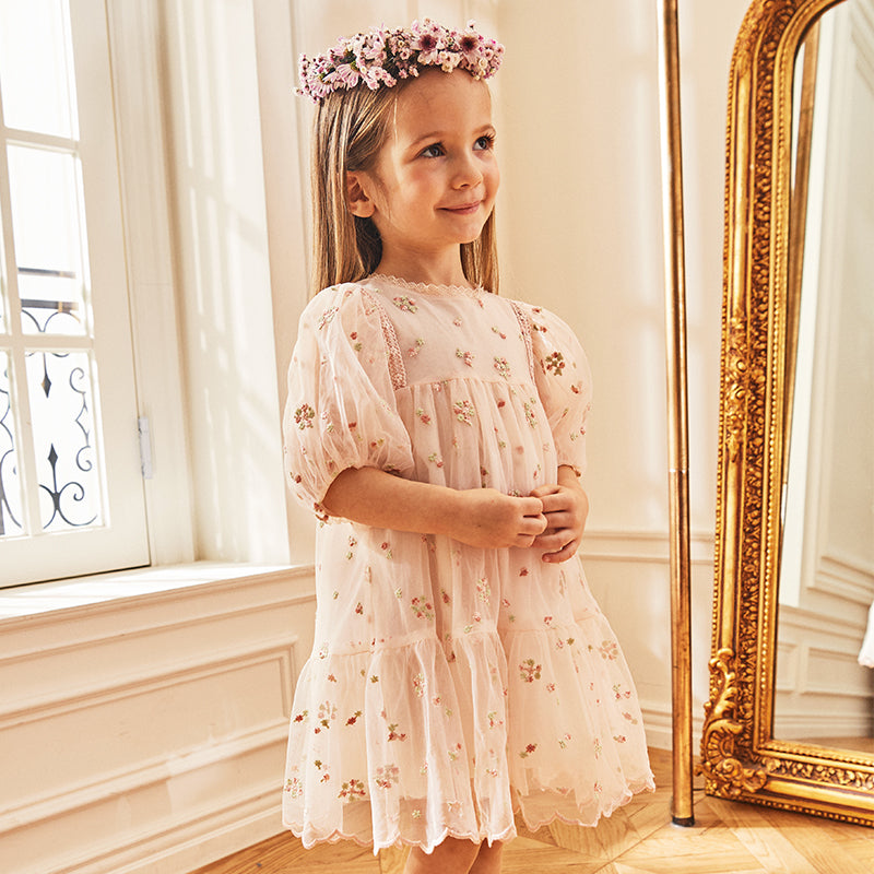 This bright and beautiful dress is perfect for any special occasion. Crafted with a 100% nylon shell and 100% cotton lining, it features a light pink tulle design with stunning floral embroidery for a truly elegant look.