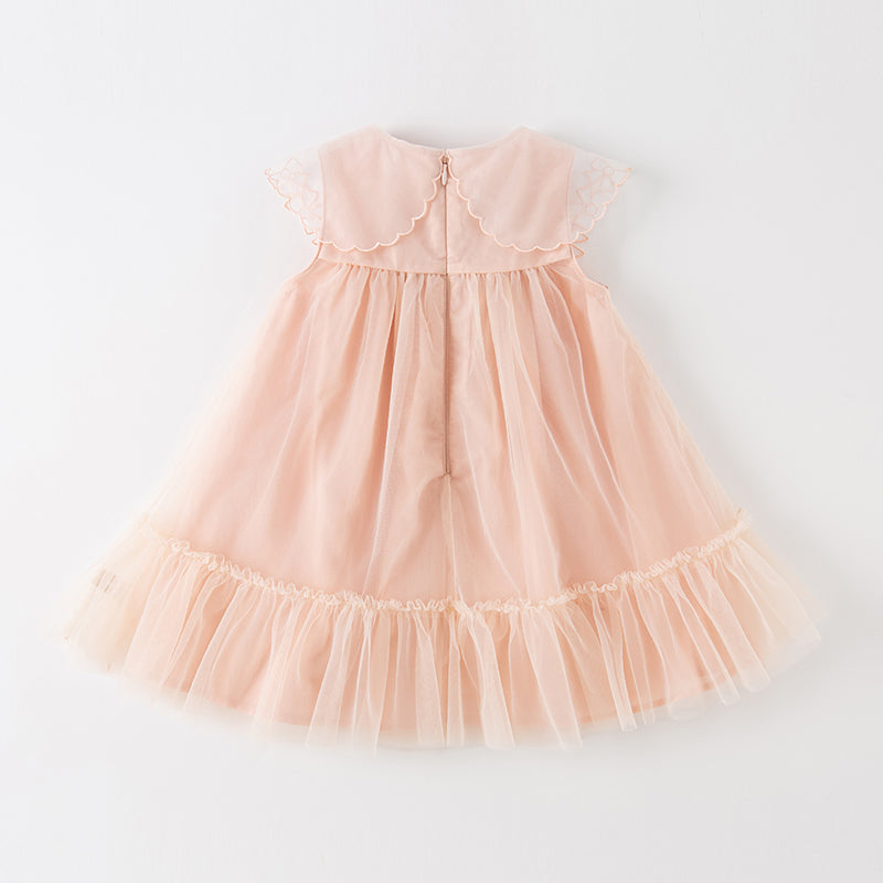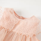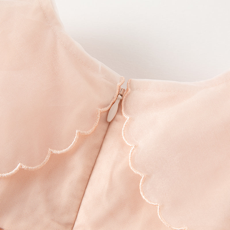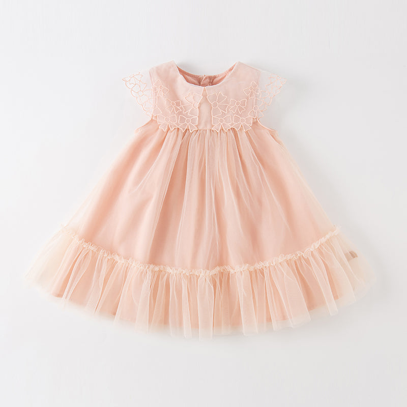 This stunning pink tulle dress is perfect for special occasions. Featuring an organza collar with intricate bow embroidery, this sleeveless dress offers a lightweight and luxurious feel.