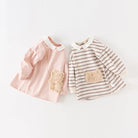 This striped tunic features a stylish white collar and a convenient button-back closure for easy wear. The adorable teddy purse detail at the front adds a charming touch. Perfectly paired with leggings from our latest collection, this tunic is crafted from a comfortable and durable blend of 90% cotton and 10% spandex.
