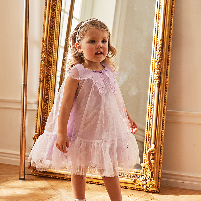 This gorgeous Purple Butterfly Dress for little girls is crafted from breathable 100% nylon tulle with accents of 100% polyester fabric and 94% nylon with 6% metal-coated fiber. Featuring a large embroidered collar and a 3D butterfly design, this dress offers a stunning and elegant finish. The interior is lined with 100% cotton for added comfort.