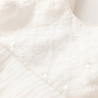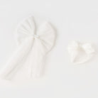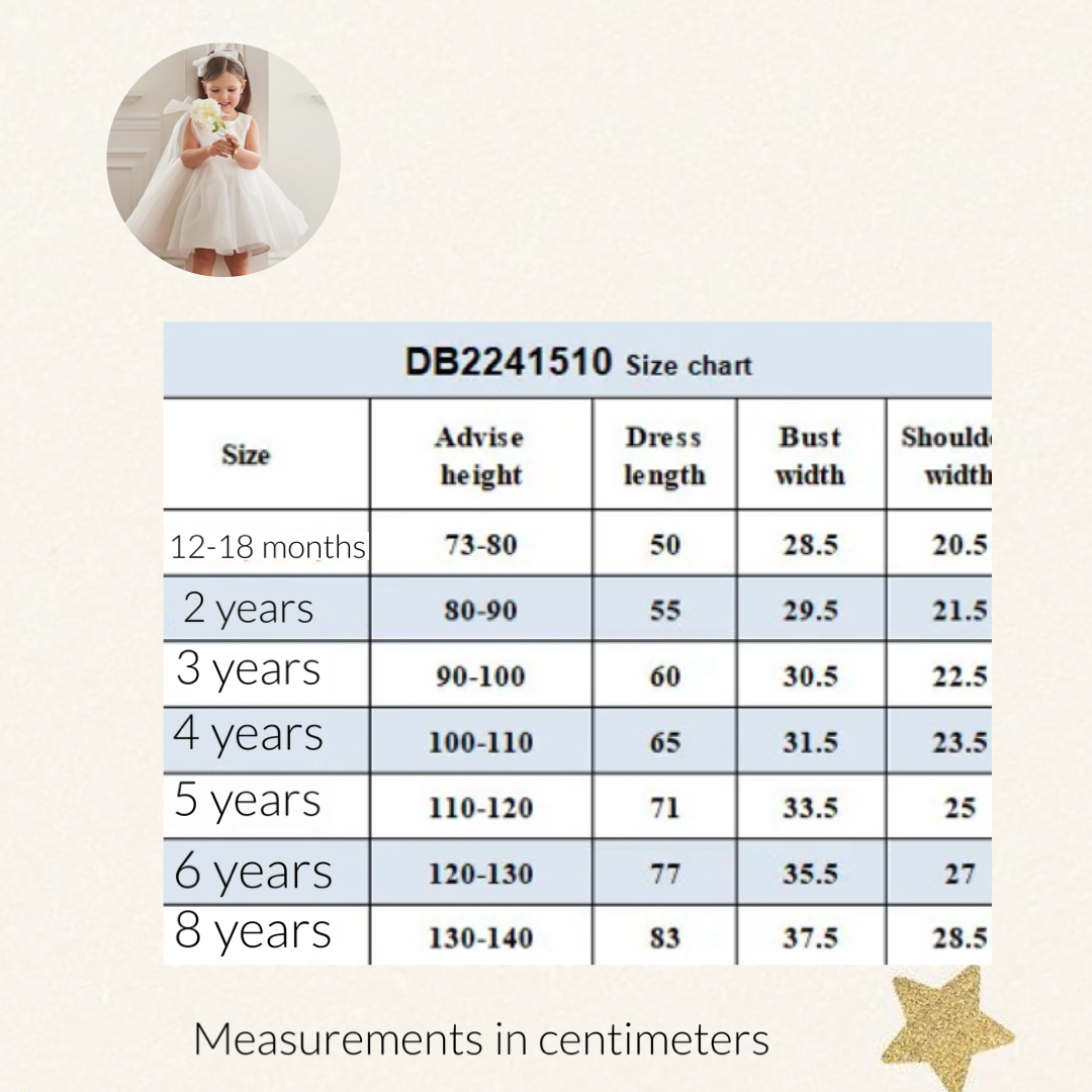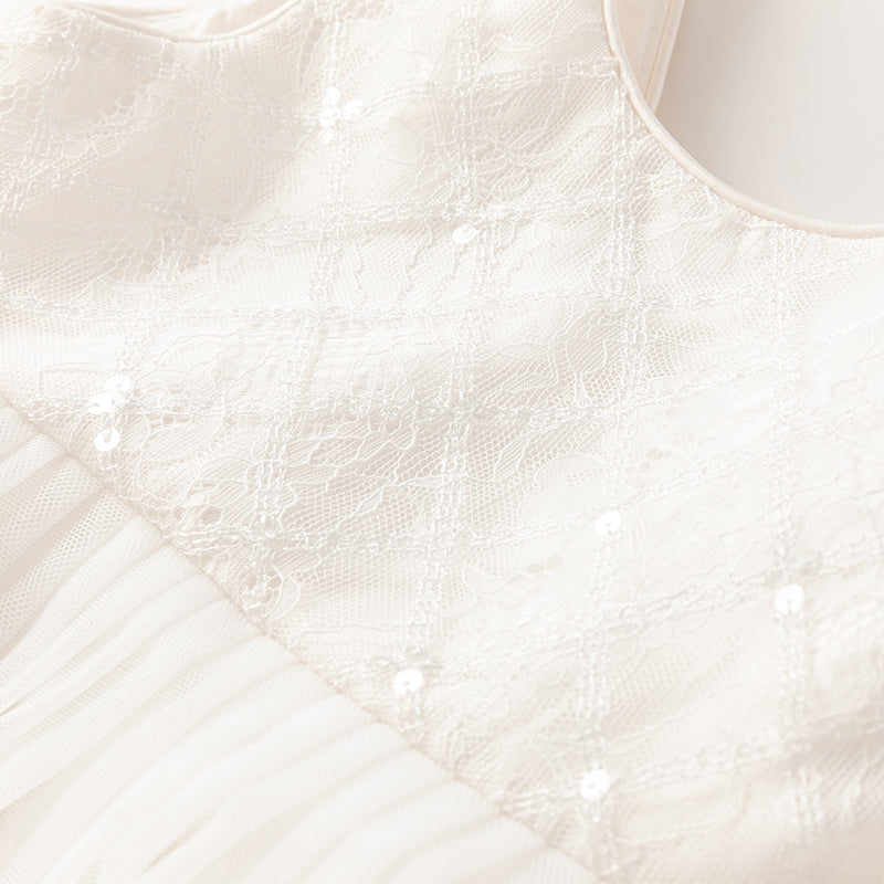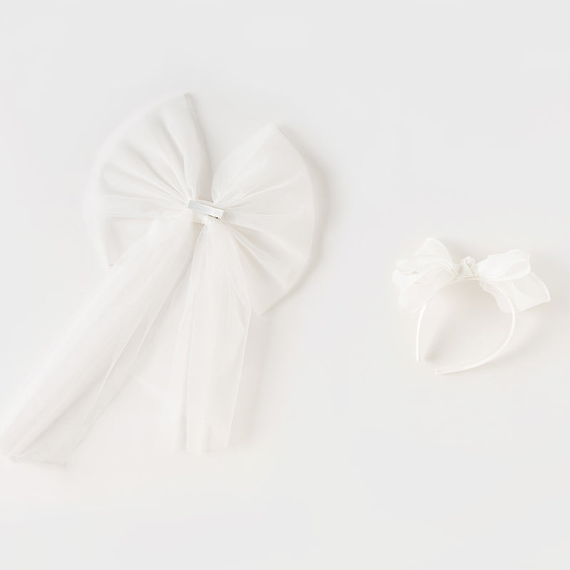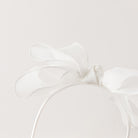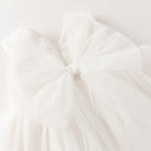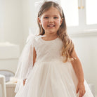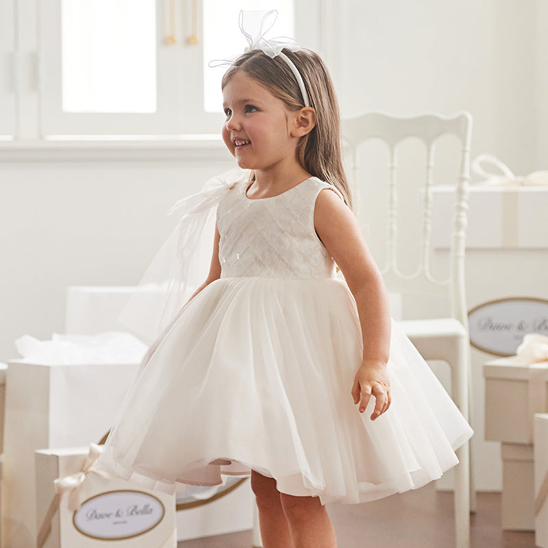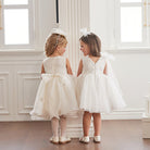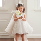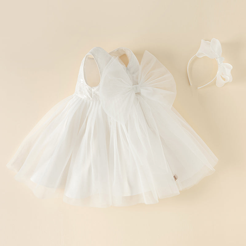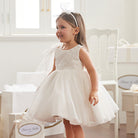 This flower girl dress features a lace-covered bodice with sequins and embroidery, a large bow on one shoulder, and a flowing skirt. It includes a removable bow at the back and a matching bow headband.