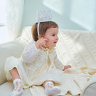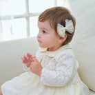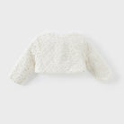 Elevate your little one’s wardrobe with this exquisite ivory dress and jacket set. Designed with elegance and comfort in mind, it’s perfect for special occasions and family gatherings. Comes with a headband for perfect styling.
