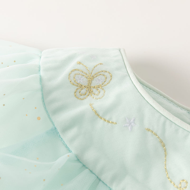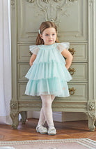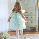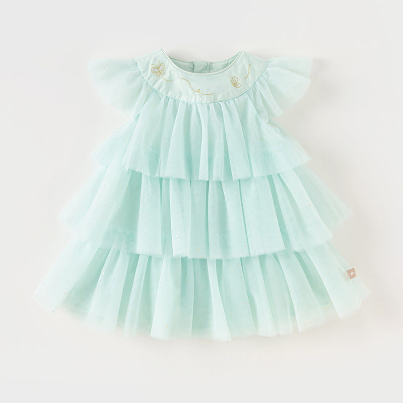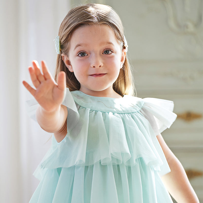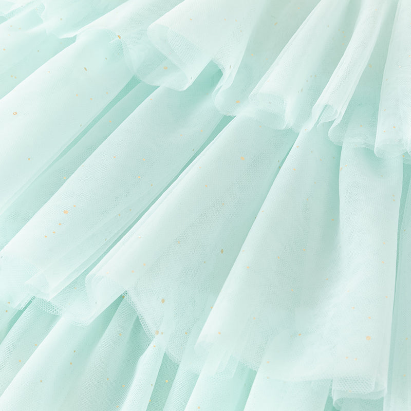 Elegant Sea Foam Party Dress: This sea foam-colored dress exudes elegance with its simple yet sophisticated design. Perfect for warmer temperatures, it features a breathable cotton lining and multiple layers of delicate mesh that create a graceful, flowing silhouette.