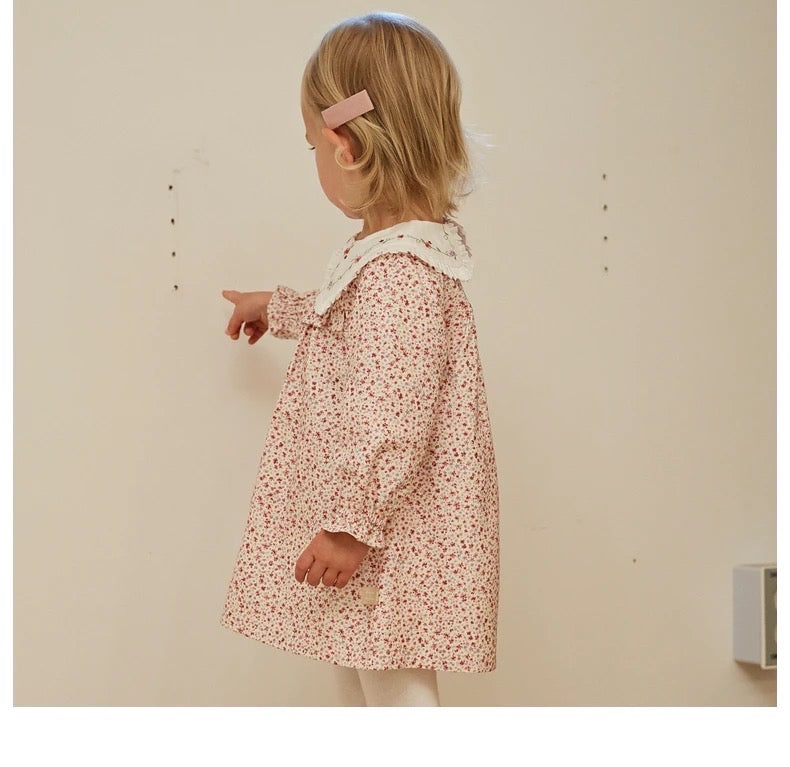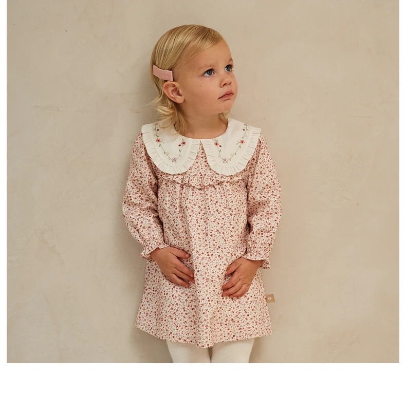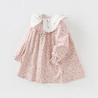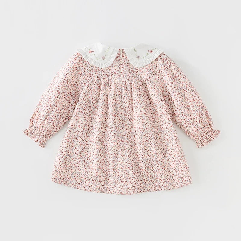 This 100% cotton floral-print long-sleeved dress for girls features charming frill details and a large white collar adorned with delicate flower embroidery. Perfect for stylish and fun-loving girls, the premium cotton fabric ensures lasting softness even after multiple washes.