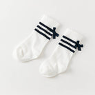 Boasting timeless style with a unique twist, these knee-high socks feature a three-stripes detail and a charming bow at the back. Perfect for adding a stylish touch to your outfit.
