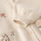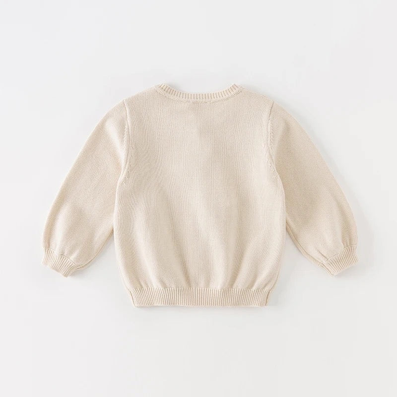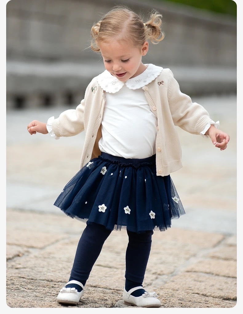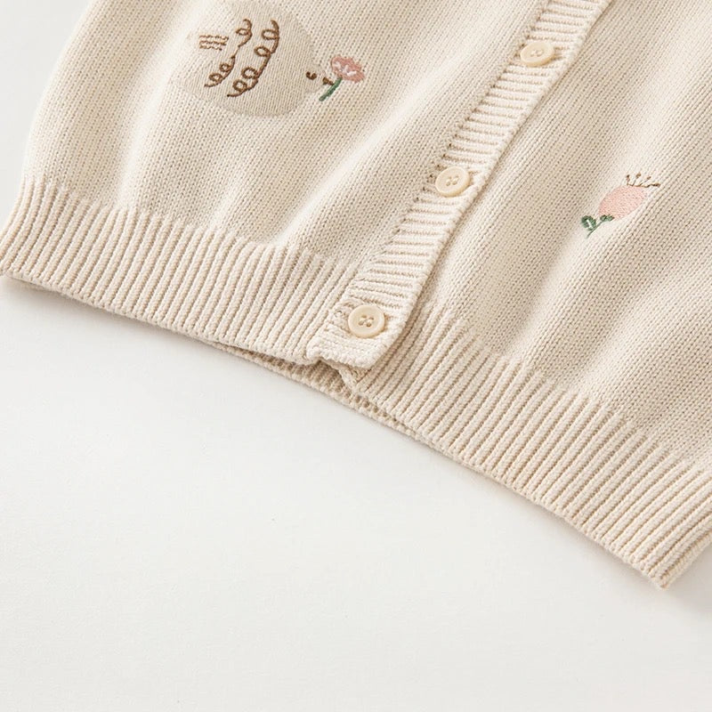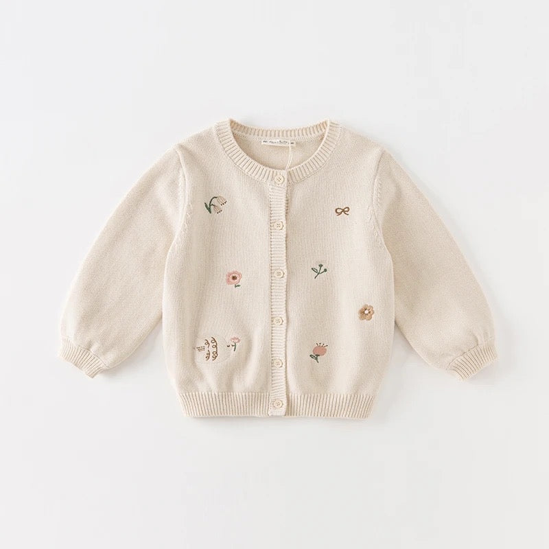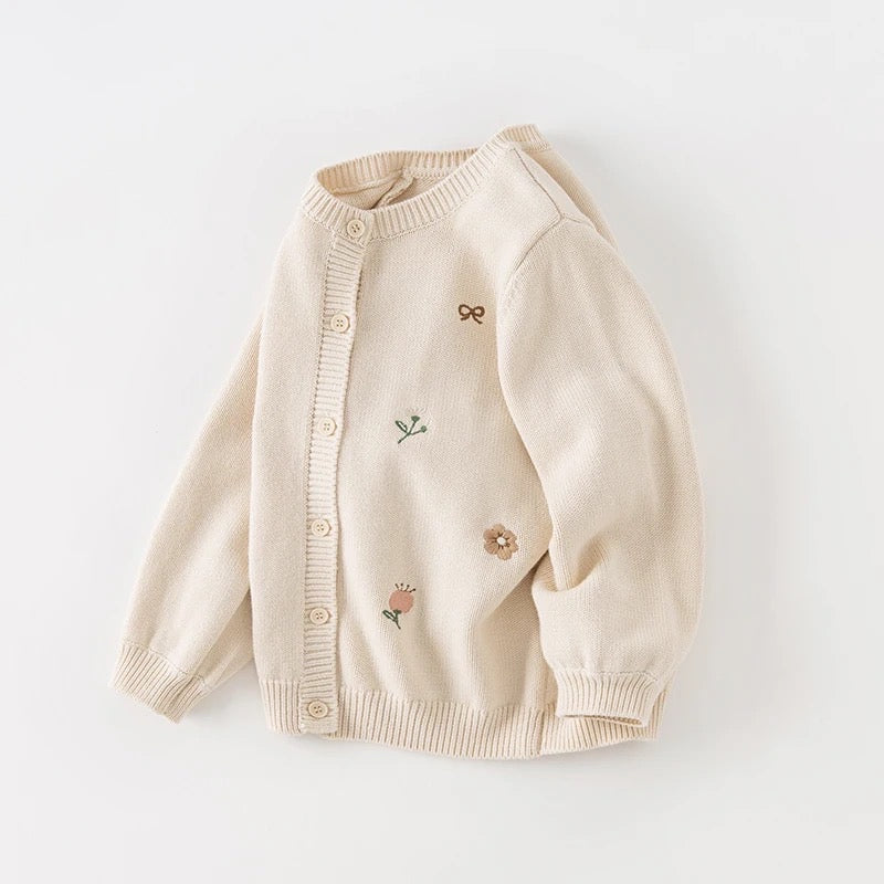 This classic beige cardigan for girls is adorned with delicate flower embroidery for a charming touch. Crafted from 100% cotton, it provides all-day comfort and is easy to pair with any outfit, making it a versatile wardrobe staple.