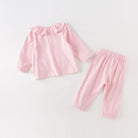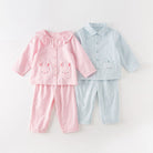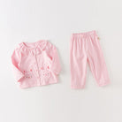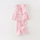 Features: This set includes a button-up top with a ruffled collar and matching pants. The top showcases a cute bunny-shaped pocket on the front, enhancing its playful appeal. The pants are fitted with an elastic waistband for a comfortable, secure fit.
