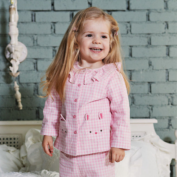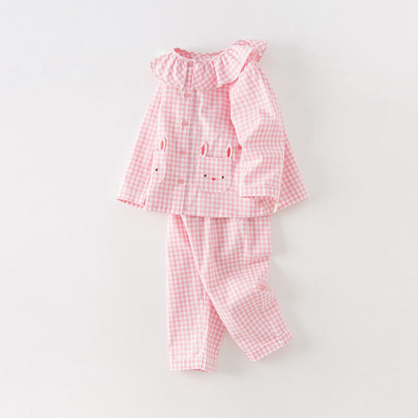Introduce a splash of fun to bedtime with our adorable pink plaid pajama set for girls. This set features a playful bunny pocket design on the jacket, adding a touch of whimsy that your little one will love. The soft pink checks provide a classic yet charming look, making these pajamas a delightful choice for restful nights and cozy mornings.