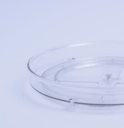 High quality and break-resistant transparent acrylic turnable. This design is durable, rotates smoothly, and is easy to clean. The uses of this version of our Lazy Susan can extend beyond the kitchen and pantry as it low edges allow it to sit beautifully on any dresser or table.